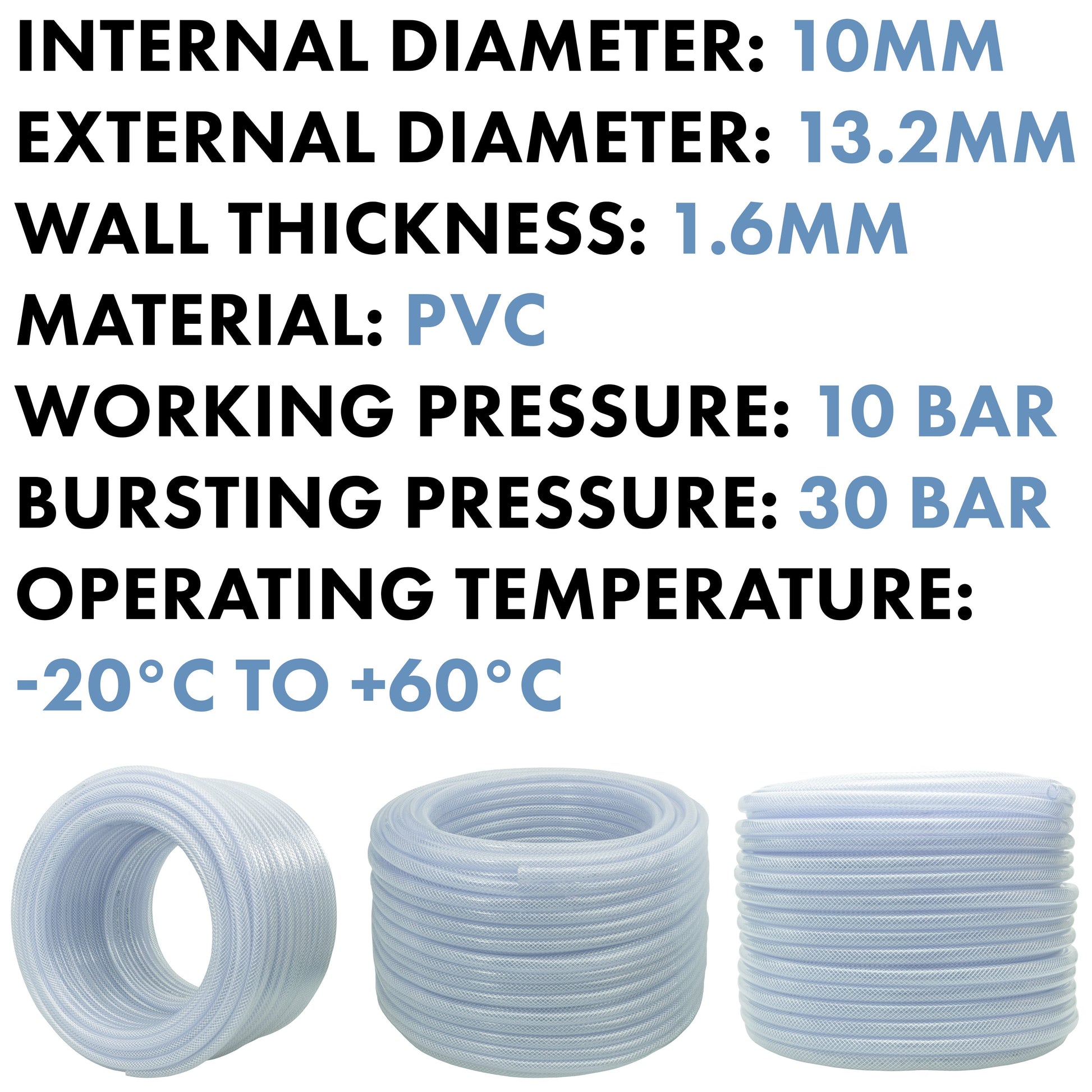 With its proven reliability and compatibility, our Clear Braided PVC Pipe stands as a trusted solution for fluid transportation needs across industries. This pipe has an internal diameter of 10mm and a wall thickness of 1.6mm.